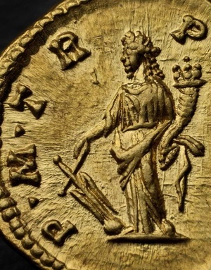 Die Vorderseite der goldenen Münze zeigt den Kaiser Didius Julianus bärtig und mit Lorbeerkranz nach rechts und eine Umschrift mit seiner Titulatur. Auf der Rückseite ist die Göttin Fortuna mit einem auf einer Kugel ruhenden Steuerruder und überquellendem Füllhorn abgebildet, ebenfalls mit Umschrift. Fortuna gilt als Schicksalsgöttin, die auf einen glücklichen Ausgang bedacht war, dem Kaiser aber kein Glück brachte. Zwar gelang es ihm, sich den Kaiserthron zu erkaufen, doch wandten sich das Volk und der Senat bald gegen ihn und er wurde nach nur 66 Tagen im Amt erschlagen. Münzen mit seinem markanten Porträt sind daher äußerst selten. Die Münze ist Bestandteil des im Jahre 1993 in Trier entdeckten Goldschatzes.