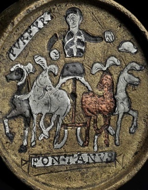 Dieser Kontorniat mit Wagenrennen ist auf beiden Seiten mit Einlegearbeiten verziert. Die Vorderseite lässt zwischen zwei mit Palmzweigen gefüllten Behältern einen Wagenlenker mit Peitsche erkennen. Am rechten oberen Rand ist PORFYRI zu lesen. Die Rückseite zeigt ein Viergespann von vorn. Der Lenker hält eine Peitsche und einen Palmzweig, sein Sturzhelm fliegt zur rechten Seite. Am linken oberen Rand steht wiederum PVRFYRI, unterhalb der Darstellung FONTANVS. Der Name Porphyrius erscheint häufiger - auch auf geschnittenen Kontorniaten - als Name eines Wagenlenkers. Fontanus dürfte dagegen der Name seines Leitpferdes gewesen sein.