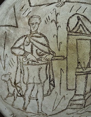 Die gläserne Trinkschale zeigt eine bekannte Szene aus dem Alten Testament, in welcher Abraham Isaak opfert. Das Motiv ist in die Außenseite eingeritzt, ist aber von innen zu betrachten. Mittig vor einem Schrein erhebt sich ein Altar, von welchem rechts davon Isaak mit auf den Rücken gebundenen Händen steht. Seine Schultern werden von einem Mantel bedeckt. Sein Vater Abraham, in kurzem Gewand und Mantel, hält das Opfermesser bereit. Hinter diesem ist der anstelle Isaaks zu opfernde Widder sichtbar. Über der Szene erscheint der Arm Gottes mit ausgestreckter, Einhalt gebietender Hand. Die landschaftliche Umgebung wird durch Pflanzen sowie die wellige Bodenlinie deutlich. Unterhalb des Randes verläuft ein Spruchband: VIVAS IN DEO Z(eses) - Du sollst leben in Gott, damit du lebst. Diese Trinkschale gehört zur Sammlung der Gesellschaft für nützliche Forschungen Trier, die im Rheinischen Landesmuseum Trier aufbewahrt wird.