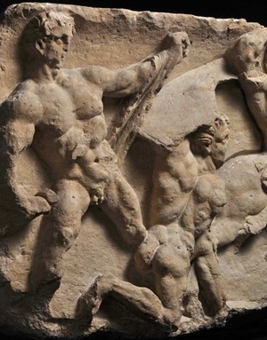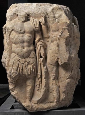 Auf diesem Relief wehren sich zwei nackte Kämpfer verzweifelt gegen einen gepanzerten Reiter, der über die Schulter hinweg zum Schlag ausholt. Der kauernde Krieger schützt sich mit einem Schild keltischen Typs, während der stehende Mann ein Manteltuch zur Deckung um den Arm geschlungen hat. Die Darstellung der Schmalseite verbindet in typisch römischer Bildsprache Realität und Fiktion: Neben einem Feldherrn in Paraderüstung steht ein unbekleideter Krieger mit einem runden Schild, wohl eine Gottheit oder eine Personifikation. Das Relief gehörte zu einem großen Bogenmonument, das in der Nähe der Trierer Römerbrücke stand. Wegen seines Reliefs muss sich das Bauwerk auf ein kriegerisches Ereignis beziehen, wohl auf den Sieg der Römer gegen aufständische Gallier um das Jahr 70 n. Chr.