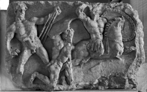 Auf diesem Relief wehren sich zwei nackte Kämpfer verzweifelt gegen einen gepanzerten Reiter, der über die Schulter hinweg zum Schlag ausholt. Der kauernde Krieger schützt sich mit einem Schild keltischen Typs, während der stehende Mann ein Manteltuch zur Deckung um den Arm geschlungen hat. Die Darstellung der Schmalseite verbindet in typisch römischer Bildsprache Realität und Fiktion: Neben einem Feldherrn in Paraderüstung steht ein unbekleideter Krieger mit einem runden Schild, wohl eine Gottheit oder eine Personifikation. Das Relief gehörte zu einem großen Bogenmonument, das in der Nähe der Trierer Römerbrücke stand. Wegen seines Reliefs muss sich das Bauwerk auf ein kriegerisches Ereignis beziehen, wohl auf den Sieg der Römer gegen aufständische Gallier um das Jahr 70 n. Chr.