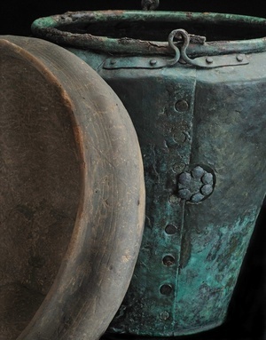 Eine interessante Grabausstattung der älteren Eisenzeit umfasst diese beiden Gefäße. Tongeschirr wie diese einfach verzierte Schüssel findet sich in fast jedem keltischen Grab, es ist eine Anspielung auf Essen und Trinken, also Leben und Geselligkeit. Ungewöhnlich ist allerdings das zweite Gefäß, es ist ein Eimer aus Bronze, der nicht mehr neuwertig war. Er wurde in Zweitverwendung als Urne genutzt, um den Leichenbrand eines erwachsenen Mannes beizusetzen. Gewöhnlich reichte dazu auch ein Tongefäß, der Tote nahm aber offensichtlich eine Sonderstellung in seiner Umgebung ein. Denn Metallgefäße konnten zu dieser Zeit in der Eifel gar nicht hergestellt werden und waren Luxus. Woher genau das Gefäß kam ist unklar, aber es ist jedenfalls die erste fassbare Kontaktaufnahme aus dieser Region mit dem südalpinen Gebiet.