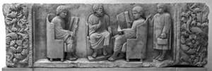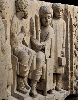 In diesem Relief sitzt der Lehrer zwischen zwei Schülern. Ein dritter, der von rechts herankommt, hebt die Hand - nicht entschuldigend für seine angebliche Verspätung, wie gelegentlich behauptet wird. Vielmehr ist er der jüngere Schüler, der seine älteren Brüder ablöst. Im Vergleich zu den beiden anderen ist er kleiner. Bei genauerem Hinsehen fällt auf, dass seine Tunika kürzer ist und engere Ärmel hat. In der Hand trägt er ein Bündel von Wachstäfelchen. Er lernt schreiben; die älteren Knaben haben Schriftrollen als Lektüre zu einem Unterrichtsthema. Nicht allein in der figürlichen Darstellung, auch in der bildhauerischen Arbeit an den Ranken aller skulpierten Seiten, offenbart sich eine hohe Steinmetzkunst. Eine Voraussetzung für die qualitätvolle Arbeit war auch die Beschaffenheit des ausgewählten Sandsteinblockes, der in allen Partien gleich feinkörnig ist.