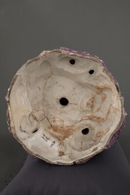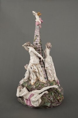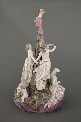 "Sieg der Schönheit über den Neid", allegorische Pyramidengruppe von Konrad Linck. Die "Schönheit", wird versinnbildlicht durch ein Mädchen, das auf einem Felssockel sitzt und in den Spiegel blickt. Der "Neid" windet sich in Gestalt eines Mannes am Boden. Um die titelgebenden Figuren tanzen drei Grazien - Aglaia, Euphrosyne und Thalia - einen Reigen um einen emporragenden Obelisken, einem Symbol der Ewigkeit. Auf der Spitze des Obelisken sitzt ein Putto als Symbol des Sieges. Die Putten auf der Rückseite umarmen und küssen sich. Sie sind der Schönheit zugeordnet (Schönheit, durch Liebe geboren, besiegt den Neid - siehe Werhahn 1999). Im Mannheimer Preisverzeichnis von 1777 ist die Gruppe als "Concordia, oder die große Pyramide" aufgenommen. Mit 60 Gulden gehörte die farbige Fassung der Gruppe zu den teuersten Frankenthaler Erzeugnissen. Blaumarke "CT" mit Kurhut und "B" darunter, Jahresangabe °79°. Vergleichsstücke in Mannheim, Reiss-Museum (REM 2004/10) - weitere Vergleichsstücke siehe Beaucamp-Markowsky. Zustand: Zahlreiche geklebte Bruchstellen, Zahlreiche Fehlstellen; Ergänzungen: Putto an der Spitze komplett, Teile der Hände und Finger, des Sockels und des Gewands des Mannes (Neid)