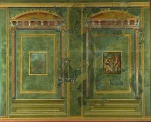 Die aus vielen Bruchstücken von bemaltem Putz rekonstruierte sogenannte Grüne Wand zeigt, in einem zum großen Teil vollständig wieder zusammengesetzten Bildfeld, eine Szene aus der griechischen Heldensage: Jason raubt das goldene Vlies. In der Mitte des Bildes hängt das kostbare Fell des Widders von einem Baumstamm herab. Es wird von einer sich darum windenden Schlange bewacht. Die links auf einem Felsen sitzende Königstochter Medea taucht den Kopf der Schlange in einen Zaubertrank, um ihrem Geliebten Jason den Raub zu ermöglichen. Fluchtbereit hält Jason bereits das Vlies mit der erhobenen Rechten. Die Rekonstruktion der gesamten Wand von etwa 6 m Höhe zeigt die übliche Gliederung römischer Wände in Sockel, Haupt- und Oberzone. Über einem schwarzgrundigen, mit Blattstauden und rosa Blüten verzierten Sockel, von dem noch Bruchstücke vorhanden sind, erheben sich auf einem gegliederten Postament hohe Nischen (Ädikulen) vor grünem Grund. Schmale gelbe Säulen rahmen sie ein, und das verzierte Gesims mit halbrundem Giebel bildet den Abschluss. Die Mitte der Nischen nehmen hochrechteckige Bilder ein. Getrennt werden die Ädikulen von langen, schmalen Feldern, die mit Ranken und Figuren gefüllt sind. Von der ehemals sich anschließenden Oberzone ist nur noch ein Bild mit Stieropfer erhalten.
