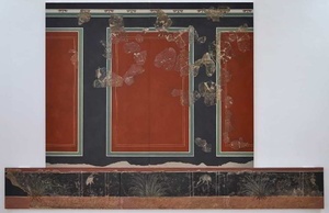 Tierdarstellungen wie dieser auf Putz gemalte Reiher stellen in der römischen Kunst des 1. und 2. Jahrhunderts n. Chr. ein beliebtes Wandsockelmotiv dar. Das Bild gehört zu einer aus vielen Bruchstücken zusammengesetzten und ergänzten Wandmalerei, die einst einen Flur in einem großen römischen Haus schmückte. Die Felder der Sockelzone dieser Malerei füllen abwechselnd Blattstauden und anmutige Reiher. Die Hauptzone bestimmen hochrechteckige rote, gerahmte Felder. Zarte gelbe Ornamentbänder bilden die innere Umfassung. Ständer mit Schirmchen (Schirmkandelaber) trennen die Felder voneinander und auf ihren Ecken sitzen springende, geflügelte, ziegenähnliche Fantasietiere. Ornamentbänder schließen zur Decke hin ab. Die Farbwahl von Rot und Schwarz entsprach dem Zeitgeschmack des 1. Jahrhunderts n. Chr. Die Maler arbeiteten nach bestimmten Vorlagen in Musterbüchern, somit erklärt sich die Wiederholung: Die Blattstauden und Reiher finden wir auch in anderen Trierer Häusern dieser Zeit.