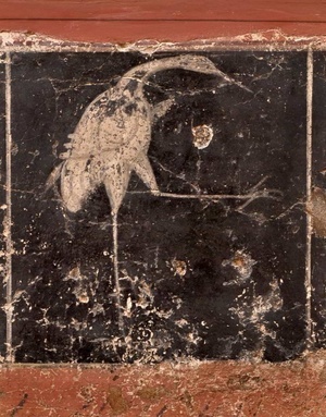 Tierdarstellungen wie dieser auf Putz gemalte Reiher stellen in der römischen Kunst des 1. und 2. Jahrhunderts n. Chr. ein beliebtes Wandsockelmotiv dar. Das Bild gehört zu einer aus vielen Bruchstücken zusammengesetzten und ergänzten Wandmalerei, die einst einen Flur in einem großen römischen Haus schmückte. Die Felder der Sockelzone dieser Malerei füllen abwechselnd Blattstauden und anmutige Reiher. Die Hauptzone bestimmen hochrechteckige rote, gerahmte Felder. Zarte gelbe Ornamentbänder bilden die innere Umfassung. Ständer mit Schirmchen (Schirmkandelaber) trennen die Felder voneinander und auf ihren Ecken sitzen springende, geflügelte, ziegenähnliche Fantasietiere. Ornamentbänder schließen zur Decke hin ab. Die Farbwahl von Rot und Schwarz entsprach dem Zeitgeschmack des 1. Jahrhunderts n. Chr. Die Maler arbeiteten nach bestimmten Vorlagen in Musterbüchern, somit erklärt sich die Wiederholung: Die Blattstauden und Reiher finden wir auch in anderen Trierer Häusern dieser Zeit.