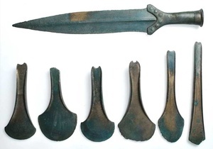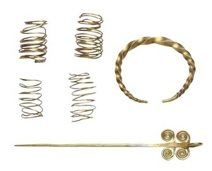 Dieser Hortfund aus Bronzegeräten und Goldschmuck zeigt, dass während der Bronzezeit neben dem namengebenden Metall auch Gold routiniert verarbeitet wurde. Aus goldenem Doppeldraht gedrehte Spiralen mögen eine einfache Handelsform dieses Materials gewesen sein, auch wenn sie als Fingerringe, Haar oder Kleiderschmuck getragen worden sein können. Ein tordierter Armreif und eine Gewandnadel mit spiralverziertem Kopf sind dagegen ganz eindeutige Schmuck- und Trachtelemente. Die Nadel diente zum Verschließen eines Capes oder Umhanges über der Brust, ist aber in ihrer individuellen Gestaltung ein Unikat. Neben einem Kurzschwert gehören zu diesem Fundkomplex fünf bronzene Beilklingen, sogenannte Randleistenbeile, deren gestreckte Form ihre nächsten Analogien im süddeutsch-schweizerischen Raum findet. Um 1600 v. Chr., zu Beginn der mittleren Bronzezeit, wurde dieses wertvolle Ensemble zwischen Steinen versteckt oder deponiert.