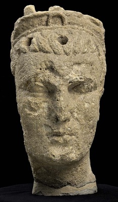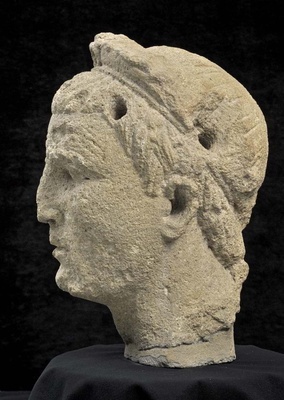 Der etwa lebensgroße Kalksteinkopf stammt, nach der Ausarbeitung der rechten Seite zu schließen, ursprünglich von einem hohen Relief. Er weist durch verschiedene Elemente die Überarbeitung und Wiederverwertung eines einst weiblichen Poträts auf. So lässt sich anhand von Merkmalen der Frisur erkennen, dass es sich ursprünglich um Sabina, die Gattin des Kaisers Hadrian, gehandelt hat. Die Bohrlöcher oberhalb der Stirn waren zur Befestigung einer Strahlenkrone aus Metall, dem Attribut des Sonnengottes Sol, gedacht. Konstantin war so in der Gestalt des Gottes Sol dargestellt.