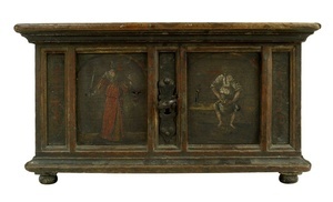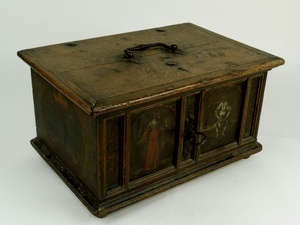 Zunftlade (bzw. Zunfttruhe) einer Töpferzunft. Truhe aus massivem Eichenholz mit schmiedeeisernen Beschlägen und originalem Schloß mit Schlüssel. Schloß und Bänderung sind zisiliert. Farbige Fassung, Vorderseite mit zwei Figuren bemalt ( links: Justitia, rechts: Töpfer an Drehscheibe), auf den Seiten ist je ein doppelköpfiger Reichsadler noch gerade erkennbar. Im Inneren befindet sich auf der linken Seite ein kleines Fach mit Klappe. Auf der Innenenseite des Deckels ist nachfolgende Beschriftung angebracht: "M.Jacob Wiehenckell, M.Daniell Strum, M.Vollentin Böttger, M.Jorgen Zegß, ANNO 1648". Bei den Namen handelt es sich wohl um die Zunftmeister.