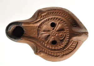 Diese vollständig erhaltene Lampe wird gekennzeichnet durch volutenartige Vorsprünge an der Schulter in Höhe des breiten, vertieft liegenden Schnauzenkanals. Ein schmaler Strichelkranz schmückt die gerade Schulter, und eine plastische Leiste umgibt den leicht eingesenkten Spiegel und den Schnauzenkanal. Ebenso sind der Schnauzenkanal und auch der leicht eingesenkte Spiegel von einer plastischen Leiste umgeben. Das Christogramm im Spiegel ist von einem schmalen Strichelkranz gerahmt. Zwischen den Balken befindet sich je ein kleines Ölloch. Die flache Standfläche mit eingetiefter Bodenmarke ist von einer Rille umgeben.
