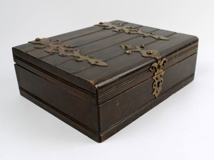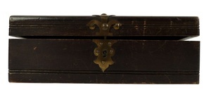 Die Holzkiste, hergestellt aus dunkler Eiche, ist mit Messingbeschlägen versehen. Sie hat eine horizontale Riefelung, so dass der Eindruck von einzelnen Brettchen entsteht.