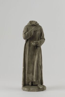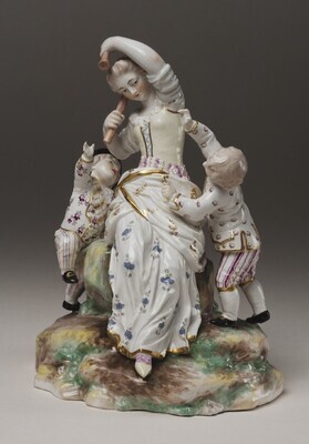Porzellanfigur eines Knaben der nach links springt. Den rechten Arm hat er erhoben, den Linken nach vorne gestreckt. In der linken Hand hält er ein Brettchen auf das ein Herz gemalt ist, das er am Stiel hält. Sein linkes Bein ist nach hinten ausgestreckt. Das rechte Bein ist verbunden mit der Baumstumpfstütze. Der Grassockel auf dem der Junge steht ist annähernd rund. Bekleidet ist er mit einer blauen Kniehose, weißen Kniestrümpfen und schwarzen Schuhen. Seine Jacke ist in zwei unterschiedlichen Purpurtönen und mit Streublumen bemalt. Der Saum und die Streublumen sind dunkler als der restliche Stoff der Jacke. Unter der Jacke trägt er ein weißes Hemd mit gerüschten Ärmeln. Seine nach hinten gekämmten, gelockten Haare reichen ihm fast auf die Schultern. Blaumarke Rad mit D (Graesse S. 148: Steingut v. Damm), eingeritzte Nummer 223.