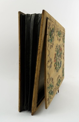 Deckel mit Rahmen und Unterseite sind aus Holz, das bezogen wurde. Die Seitenwände werden aus zieharmonika-artig gefalteter, textil überzogener Pappe gebildet, wodurch sich die Höhe der Mappe dem Umfang des Inhalts anpassen kann. Der textile Bezug des Deckels ist mit einer Buntstickerei bestehend aus einem Bouquet aus verschiednenen Blüten und Knospen umgeben von Ranken mit Blättern verziert. In einem Teil der Blätterranken sind Initialen eingearbeitet: oben links ’RM’, oben Mitte: ’SA’ und oben rechts ’PB’. Zum Öffenen des Deckels ist an einer der Längsseiten eine Lederlasche angebracht.