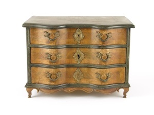 Kleine Zierkommode mit Rocaille-Beschlägen. Im Grundriss zweifach nach vorne gebuchtet, gerades Mittelstück. Abschluss-Platte oben mit eingelegtem übereckgestelltem Quadrat. Rückseite und Unterseite mit Tapete beklebt. Sehr zierlich gebildete Füsse und unterer Zierrand. Schlüssellochbeschläge als Rocaille-Kartusche mit gebogenem Schlüsselloch.