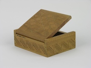 Holzkästchen auf Deckel und Seiten mit geometrischen, geschnitzten Mustern versehen ( Muster von Kästchen HM_1984_673_a_14.08. unterscheidet sich von HM_1984_673_b_14.08. Muster auf dem Deckel und am Rand).