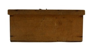 Schlichtes Holzkästchen; Verschluss durch einfach Drahtöhse und einfachen Drahthaken auf dem Deckel Inschrift auf der Innenseite des Deckels: se Vend chez J. YGOUF Md. de Papier à Spire