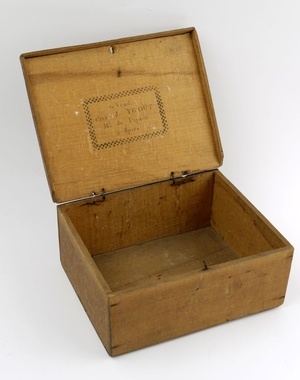 Schlichtes Holzkästchen; Verschluss durch einfach Drahtöhse und einfachen Drahthaken auf dem Deckel Inschrift auf der Innenseite des Deckels: se Vend chez J. YGOUF Md. de Papier à Spire