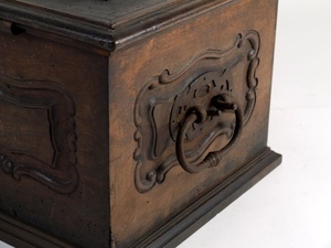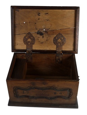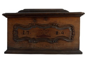 Küferzunfttruhe mit bunt eingelegtem Küferinnungszeichen und Jahresangabe Die Seitenwände durch langrechteckige Felder mit Rocaillerahmen geziert. In dem Feld der Vorderseite die schwarz eingelegte Jahreszahl und das bunt eingelegte Küferinnungszeichen, zu dessen beiden Seiten je ein Löwe steht. In dem Felde der Schmalseiten eiserne Griffe mit ornamental ausgeschnittenen Beschlägen. Auf dem Deckel ein aufgelegter, stark profilierter Rahmen, in dessen vertieftem Felde versteckt das Schloss der Truhe liegt, ehemals überdeckt durch einen in dem Profilrahmen sitzenden Schiebedeckel. Heute das Profil fälschlich ringsum geschlossen. Die Türbänder der Rückenscharniere ornamental gestaltet. Das Truheninnere mit kleinem Seitenkasten.