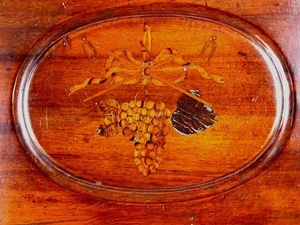 Die Zunfttruhe stammt aus dem letzten Jahrhundert des Bestehens der Landauer Weingärtnerzunft. Dass Winzer (= Weingärtner) einer Zunft angehörten, war in der Pfalz die Ausnahme. Ein großer Teil der im Weinbau arbeitenden Menschen war noch bis zum Ende des 18. Jh. als hörige Bauern einem Grundherrn abgabepflichtig. Landau gehörte im späten 18. Jh. jedoch formal zu Frankreich. Die Zunfttruhe diente der Aufbewahrung der Mitgliedsbücher, Zunftordnungen und anderer Dokumente. An der linken Innenwandung ist ein kleines Holzkästchen für Schreibutensilien angebracht. Offizielle Versammlungen der Zunft wurden immer vor der geöffneten Lade angehalten. Der Innendeckel ist bemalt: In einem Rocaillerahmen mit Baldachinstaffage bringen die Kundschafter Josua und Kaleb aus dem gelobten Land Kanaan eine Riesentraube heim. Die biblische Episode aus dem Alten Testament wurde vielfach im Zusammenhang mit dem Weinbau als Schmuckmotiv gebraucht. Neben der Malerei sind die Datierung (1784), die Namen der beiden Zunftmeister und der beiden der Zunft vorgesetzten Ratsherren angegeben. Der rechts oben aufgeführte "Herr Frantz Daguesant" wurde 1791 zum ersten Friedensrichter in Landau gewählt. Das Amt dieser bürgerlichen Laienrichter auf Kantonsebene wurde 1790 durch die Konstituante im revolutionären Frankreich und damit auch in Landau eingeführt. [Ludger Tekampe, Johanna Kätzel]