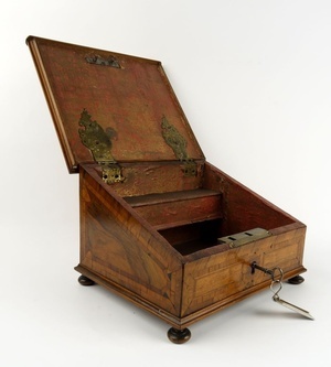Kleines schräges Lesepult, als aufklappbares Kästchen gebildet. Deckel mühlenbrett-artig eingelegt. Die hohe Frontseite hat innerhalb eines 2-fachen Band-Motives den schwarzen Doppeladler mit Schwert und Reichsapfel. Schlüssellochbeschläge als Rokoko-Kartusche geformt. 4 kleine Kugelstollen. Boden Tannenholz, Einlegearbeit in verschiedenen Nussbaumhölzern