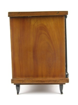 Puppenkommode; Biedermeier um 1860; Nußbaum, poliert. Als Gliederung schwarze Halbsäulchen; schwarze geschweifte Füßchen; drei gleichartige Schubladen mit Schlössern, Elfenbeinschlüsselschild und je zwei Griffringe.