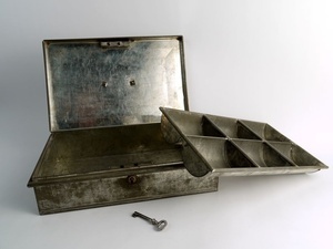 Geldkassette mit Einsatz für Münzgeld, abschließbar; auf dem Deckel oben rechts wurde "Kopp" eingeritzt.