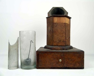 Die Schublade lässt sich öffnen; innenliegend ein Schild mit dem Hinweis: "Geschenk von Herrn M. A. Kuhn, Neustadt a.d.H." Gravur auf dem größeren Glaszylinder: G-H