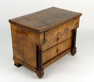 Zierkommode mit 2 flankierenden Säulchen, Wurzelholzfurnier Kleine Kommode mit 3 Schubladen. In der gleichen Höhe wie die 2 unteren Schubladen die beiden Säulchen, deren Schäfte nahezu schwarz. Postamente unter den Säulchen granatenförmig. Sie bilden die vorderen Füsse. Die hinteren Füsse sind rechteckige Stollen. Die beiden Schubladen mit leicht vorgebogener Frontseite. Rautenförmige Schlüsselloch-Holzeinlage. Darüber die 3., verkröpft-vorgezogene Schublade. Deckplatte mit 4 Frurnier-Streifen, so auch bei den Schubladen.
