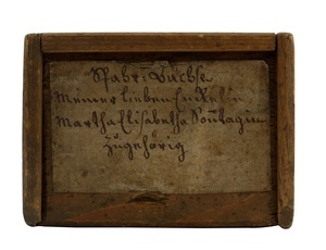 Hochrechteckiges Kästchen aus billigem Holz, natur. Auf dem Schiebedeckel aufgeklebter Zettel: "Spahr:Büchse Meiner lieben Enkelin Martha Elisabetha Sonntagin zugehörig". Vermutlich aus der Sonnenapotheke.