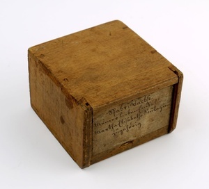 Hochrechteckiges Kästchen aus billigem Holz, natur. Auf dem Schiebedeckel aufgeklebter Zettel: "Spahr:Büchse Meiner lieben Enkelin Martha Elisabetha Sonntagin zugehörig". Vermutlich aus der Sonnenapotheke.
