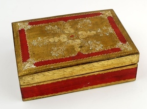 Das Holzkästchen ist in Gold und Rot mit weiß ausgelegten Ritzlinien bemalt. Der Rand mit Eckblüten ist gepünktelt und gebogt. in der Mitte ist ein kreuzförmig angeordnetes Akanthuslaubornament.