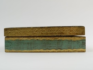 Das Holzkästchen ist in goldfarben und türkisblau bemalt. Es hat weiß ausgelegte Ritzlinien und eine symmetrisch angeordnete, kreuzförmige Akanthuslaubornamentik. Am gebogenem Rand sind Eckblüten und eine Blättchenornamentik zu sehen, auf dem Boden ein Gittermuster.