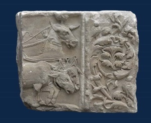Von einem Pferd und zwei Maultieren wird der beladene Wagen des Kaufmanns Lucius Securius gezogen. Möglicherweise war er Weinhändler. Die von einem Fries mit Traubenranken gefasste Grabinschrift könnte darauf hinweisen. Die Inschrift stand auf der Vorderseite des großen Grabmals. Erhalten blieb nur: "Lucius Securius…Kaufmann…"