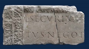 Von einem Pferd und zwei Maultieren wird der beladene Wagen des Kaufmanns Lucius Securius gezogen. Möglicherweise war er Weinhändler. Die von einem Fries mit Traubenranken gefasste Grabinschrift könnte darauf hinweisen. Die Inschrift stand auf der Vorderseite des großen Grabmals. Erhalten blieb nur: "Lucius Securius…Kaufmann…"