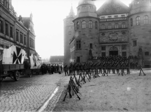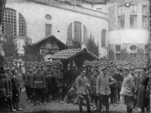 Schwarz/weiß Gruppenaufnahme vom Museumsbesuch des 1. Fußartillerie Regiments, Ersatz Batallion, 1. Batterie aus Bellheim. Datiert 17. Dezember 1914. Links im Bild Passanten und zwei Lastwagen mit Flugzeugteilen der Pfalz-Flugzeugwerke. Die Tragflächenteile gehörten zu einem in Speyer in Lizenz gebauten Pfalz/Otto-Doppeldecker der Pfalz-Flugzeugwerke GmbH der Gebrüder Eversbusch. Originaltitel: "Museumsbesuch des 1. Fußartl. Rg. Ersatz. Bat. 1. Batr. Bellheim 17. Dezember 1914"; Abzug von Platte GPN_2720