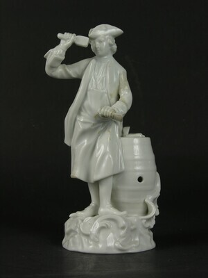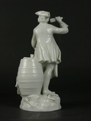 Ein Küfer mit Werkzeug am Faß. Sockel rund, mit Rocaille-Ornament. Der Küfer steht rechts neben dem Faß mit Dreispitz, Überrock und Arbeitsschürze, in der rechten hält er einen Schlegel, in der linken einen flachen, breiten Meißel. Er hat volles lockiges Haar. Blaumarke unter dem Boden.