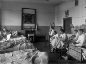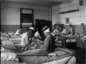 Schwarz/weiß Aufnahme von Verletzten in einem Lazarettsaal; Originaltitel: "Lazarettsaal Nr. 7 in Zeppelinschulhaus Speyer 11. Dezember 1914"; Abzug von Platte GPN_2403