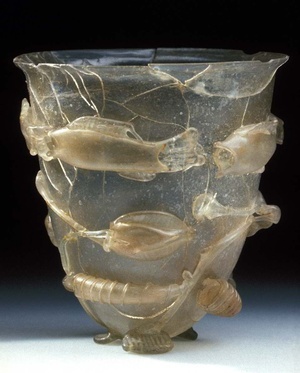Auf die Wandung des glockenförmigen Bechers sind gesondert gearbeitete Seetiere in drei Reihen gesetzt, darunter Fische, Tintenfische und schneckenförmige Tiere. Der Becher kann der Gruppe der sog. Konchylienbecher zugeordnet werden, die mit Meeresgetier verziert sind. Im Vergleich mit ähnlichen Bechern, die reich dekoriert und deren Tiere sehr detailliert gearbeitet sind, wirkt das Trierer Exemplar recht einfach. Die Fische sind übersichtlich angeordnet und nur flüchtig charakterisiert, die röhrenförmigen Tiere lassen sich nur schwer als Muränen identifizieren. Dieses Gefäß gehört zur Sammlung der Gesellschaft für nützliche Forschungen Trier, die im Rheinischen Landesmuseum Trier aufbewahrt wird.