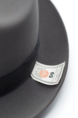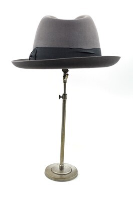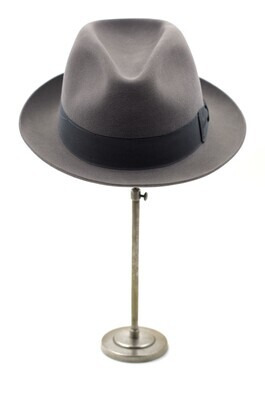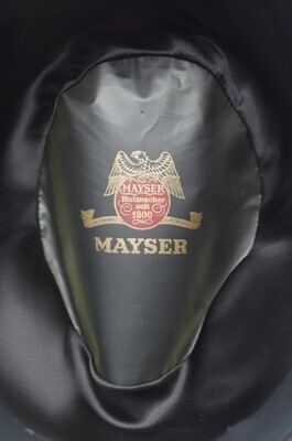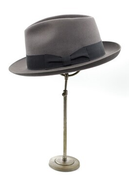 Ein Trilby aus grauem Velours von der Firma Mayser. Die offenkantig belassene Krempe ist umlaufend leicht nach oben gebogen. Um die Krone verläuft ein 4cm breites, dunkelgraues Ripsband, das auf der linken Seite gekniffen und mittels Schlaufe zu einer Schleife drapiert ist. Das Hutband ist an der Oberseite mit langen Laufstichen lose geheftet. Gefüttert ist dar Trilby mit schwarzem Satin. Das Schweißband besteht aus schwarzem Kunstleder und trägt in goldenen Lettern den Namen des Herstellers und den des Verkäufers - Mayser und W. Georg Trier. Die Überlappungsstelle des Schweißbandes ist mit einem kleinen, roten, siegelartigem Mayseremblem verschlossen. Das Futterdach ist zusätzlich foliert. Es trägt das Mayserlogo und den Firmennamen in Gold und Rot gedruckt. Das Modell ist in der Hutgröße 59 vorhanden. Die Größe sowie der aufgerufene Preis sind auf einem Pappschild vermerkt. Der Preis ist handschriftlich notiert und beläuft sich auf 129,50,-. Er scheint einmal von 119,50 korrigiert worden zu sein, da die zweite Ziffer überschrieben wurde. Der Zustand des Hutes ist gut. Die Folie im Futterdach ist vergilbt und das Hutband ist hinten geknickt.
