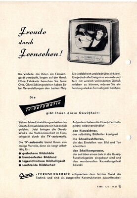4 seitige Bedienungsanleitung für die Schwestergeräte Graetz Melodia 518M und 519 im DIN A 5 Format. Gedruckt in s/w auf leicht eingefärbtem Papier. Neben einer ausführlichen Anleitung sind alle Technisch Daten abgedruckt. Erstellt wurde die Anleitung im November 1957