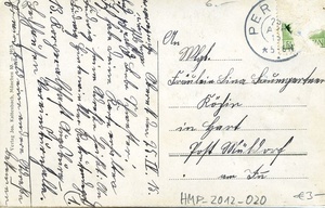 Auf der Vorderseite: Hochformatige Bildpostkarte. Der kolorierte Druck ist von einem weißen Rand eingefasst, Überschrift: "Der Weltkrieg 1914/15." Bildunterschrift: "Heilige Maria, Mutter Gottes, / beschirme unser Heer und bitte für unsere Krieger!" Das Bild zeigt eine betende Gemeinde samt Geistlichem und Messdiener vor einem barocken Altar, den eine überlebensgroße Muttergottesfigur schmückt. In einer Wolke am rechten oberen Bildrand sind die kämpfenden Soldaten eingeblendet, für die gekämpft wird. Am rechten oberen Rand der Karte "No. 1.", Karte ist wohl Bestandteil einer Serie. Auf der Rückseite: Adressat: "Wlgb. / Fräulein Lina Baumgartner / Köchin / in Hart / Post Mühldorf / am Inn", Stempel: "Per(???)", Serie: "Verlag Jos. Kaltenbach, München 10. - 1915; Der Weltkrieg 1914/15", Postwertzeichen: "Bayern". Handschriftlicher Text: "(...) den 25. IV.15. / Liebe Schwester! Ich habe Deine Karte erhalten. Ludwig seine Adresse heißt: An Ludwig Hinterwinkler Rekrutendepot 1. 13. Korporalschaft Augsburg - Lechhausen Vereinsturnhalle. Er wird bald eine andere Adresse bekommen. Es grüßt Euch alle M(...) Hinterwinkler.".