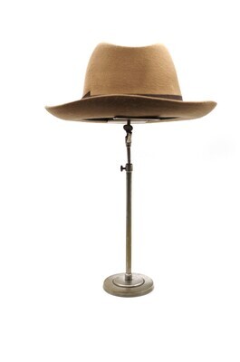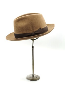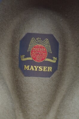 Dieser Fedora aus camelfarbenem Wollfilz stammt aus dem Hause Mayser. Die Struktur des Filzes ist noch gut zu erkennen. Das Hutband ist ein 3cm breites, dunkelbraunes Ripsband, das an der linken Seite zu einer Schleife gekniffen und mit einer Schlaufe verschlossen ist. Es ist an der Oberseite mit langen Laufstichen geheftet, die sich bereits zu lösen beginnen. Die Krempe ist offenkantig belassen und wölbt sich rundherum leicht nach oben. Der Fedora ist ungefüttert. Das leicht elastische, textile Schweißband ist dunkelbraun. An der Überlappungsstelle findet sich der kleine, runde, siegelartige Maysersticker, der die Stelle verschließt. Im Dach des Hutes befindet sich ein achteckiges Stoffstück, auf das das Mayserlogo mit Schriftzug gestickt ist. Das Modell ist einmal in der Größe 59 vorhanden. Ein Preisschild oder Ähnliches gibt es nicht. Die Größe lässt sich nur anhand des Produktionsschildes feststellen, dass unter dem Schweißband angebracht ist. Der Zustand des Hutes ist gut, lediglich die Krempe ist leicht verformt.