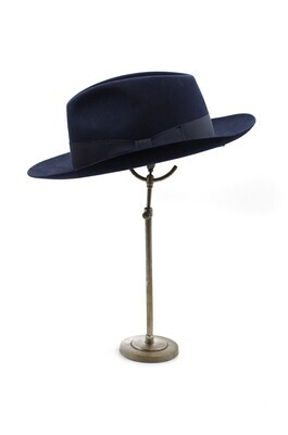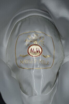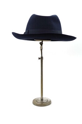 Ein Fedora aus dunkelblauem Velours. Er ist von der Firma Mayser-Milz gefertigt. Dieses Branding ist interessant, da es selten zu finden ist. Die Mayser GmbH kaufte die Firma J. Milz & Cie. 1929 auf. J. Milz & Cie. war eine, ebenfalls in Lindberg ansässige Strohhutfabrik. Dass der Hut jedoch nicht nur mit Mayser, sondern Mayser-Milz gebrandet wurde, was nie ein Firmenname von Mayser war, ist verwunderlich, auch dass es sich bei diesem Modell um einen Velourshut handelt, wobei Milz für Strohhüte bekannt war ist verwunderlich. Eine Anfrage bei der Mayser GmbH & Co. KG heute konnte leider auch keinen Aufschluss geben. Die Durchsicht des Registers des DPMA (Deutsches Patent- und Markenamt) hat ergeben, dass 1970 die Marke 'Mayser-Milz Dreistern extra' in ihre Datenbank aufgenommen wurde. Sie wurde 1969 von 'Mayser's Hutfabrik o.H.G.' beantragt und wurde 2001 wieder aus dem Verzeichnis entfernt. Aus diesem Grund ist der Hut auf nach 1970 und vor 2001 zu datieren. Der Fedora hat ein 4cm breites, dunkelblaues Ripsband, das an der Oberseite geheftet und an der linken Seite zu einer Schleife gekniffen und mit einer doppelten Schlaufe verschlossen ist. Er hat eine offene Krempe, die ringsherum leicht nach oben gebogen ist. Im Inneren findet sich ein schwarzes, leicht elastisches, textiles Schweißband. Dieses ist vorne wie hinten mit einem dünnen Korkstreifen unterlegt. Er ist mit silberweißem Satin ausgeschlagen. Das Futterdach ist zusätzlich foliert. Das ungewöhnliche Branding zeigt einen stark stilisierten Löwen, einen goldenen Kreis mit zwei roten Ems und ein darunter flatterndes Banner, gefolgt von dem Namen 'Mayser-Milz'. Während die Farben zu den typischen Mayseremblemen passen und auch die Formensprache einige typische Mayserelemente aufgreift ist die Interpretation eine völlig andere. Das Modell ist nur einmal, in der Größe 58 vorhanden. Die Größe ist ausschließlich anhand des Produktionsetikettes, welches hinten unter dem Hutfutter und Schweißband befindlich ist, auszumachen. Ein Preis- oder Größenschild ist nicht vorhanden. Der Zustand des Hutes ist gut. Lediglich die Krempe ist leicht verformt.