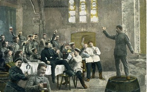 Auf der Vorderseite: Die querformatige, nachkolorierte Fotopostkarte zeigt ein Trinkgelage mit dem Titel "Soldatenleben". Auf der Rückseite: Anschrift durchgestrichen, Stempel: ""K.D. Feldpost(?) 20.6.17" und "Brief-Stempel 1. Batl. Land(???) (?)erie-Regt. 23", Serie: "K & (?) & Co., Berlin S (?); Kriegspostkarte No. 319 (29645)". Weiterhin der Aufdruck "Unser Hauptmann steigt zu Pferde / Zieht mit uns in’s Feld, Siegreich wolln’s wir England schlagen / Sterben als ein tapfrer Held!" und handschriftlich: "geschrieben d. 19.6.17 / Liebe Helena! Sende Dir hier (...) mit daß ich mich noch in der besten Gesundheit befinde, das ich auch von Dir liebe Helena hoffe. So wie ich gehört habe ist (...) (...) (...) Urlaub hat Er Dir (...) noch besucht. Nun sei hiermit recht herzlich gegrüßt von deinem Schwager Gerhard. Auf Wiedersehen." Seitlich: "Abs.: Landstur. Gerh. Heimann, 3. Komp., 1. Batl. Landstur. Inft. Rgt 23.".