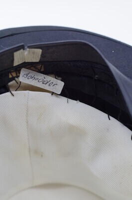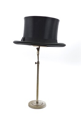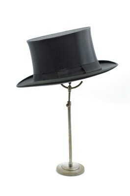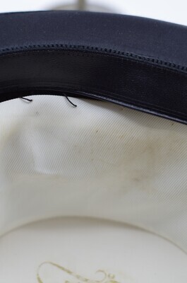 Dieser schwarze Chapeau Claque wurde im schwarzwäldischen Aachern hergestellt. Er besteht aus schwarzem Seidensatin, Schellack und dem Klappgestell, das den Chapeau Claque von einem gewöhnlichen Zylinder unterscheidet. Aleisa ist heute die einzige Firma weltweit, die den Chapeau Claque noch nach dem traditionellen Verfahren aus Seide und Schellack produziert. Er hat ein 3cm breites, schwarzes Ripsband, das links gefaltet und zusammen mit einer Schlaufe drapiert wird. Die Enden des Ripsbandes sind schräg abgeschnitten und mittlerweile ausgefranst. Die Krempe ist mit einem Ripsband eingefasst und rollt sich nach oben. Sie kragt an den Flanken stärker aus, als frontal und rückwertig. Das Schweißband aus schwarzem Leder ist aufwendig per Hand mit dem Hut verbunden worden. Es hat hinten keinen Übertritt, sondern stößt Kante an Kante aneinander und ist rückwertig mit einem Gewebeklebeband geschlossen. Es ist wahrscheinlich, dass an dieser Stelle eine Satinschleife angebracht war um die Weite zu regulieren und das Band ordentlich zu verbinden. Gefüttert ist er mit einem feinrippigem Gewebe, wahrscheinlich aus Seide. Das Futter ist per Hand eingenäht, nicht geklebt. Diese Nähte beginnen sich jedoch zu lösen, sodass sich das Futter vom Hut trennt. Auf dem Futterdach ist das Firmenemblem in Gold aufgedruckt. Der Druck ist abgerieben und nur noch schwer erkennbar. Interessant ist noch ein kleines, handschriftliches Klebeetikett, das den Namen 'Schröder' trägt. Vermutlich der ehemalige Besitzer des Hutes. (siehe Abb.) Das Modell ist ein einziges mal vorhanden. Es gibt keine Angaben zur Größe oder Ähnlichem. Der Zustand des Hutes ist schlecht. Wie beschrieben löst sich das per Hand eingenähte Futter ab, es ist zudem stark verschmutzt, der Logodruck im Futterdach ist abgerieben und das Hutband an der Schnittstelle ausgefranst. Jedoch sind dies sowie die handwerkliche und hochwertige Verarbeitung, wie auch die Materialien einschlägige Indizien für die Authentizität des Chapeau Claque. Ich vermute er wurde im beginnenden 20. Jahrhundert gefertigt. Auf jeden Fall jedoch nach 1905, da erst nach diesem Jahr unter dem Firmennamen Aleisa produziert wurde.