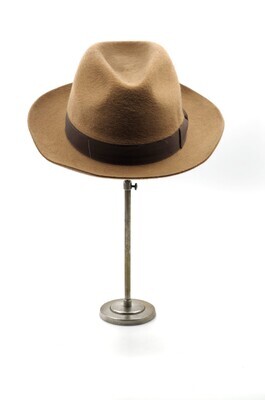 Strohhut mit extra breiter Krempe. Auf der Krempe liegt locker dunkelbrauner Tüll der von einem 6cm hoher Hutband aus dem gleichen Material zusammengefasst ist. Das Hutband laüft hinten in einer Schleife aus, die über die Krempe hinausragt. Vorne ist eine helle Brosche angebracht.