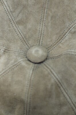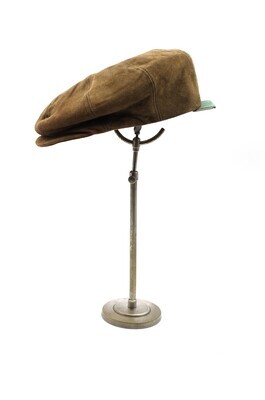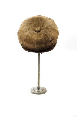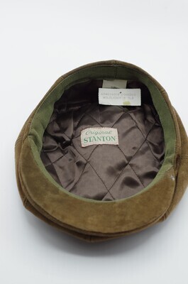 Die Ballonmütze, oder auch Newsboy Cap genannt, ist aus braunem Veloursleder gefertigt und stammt von der Firma Original Stanton. Wie für diese Mützenform typisch besteht ihr Dach aus acht Segmenten, die mit olivgrünem Garn abgesteppt sind. In der Mitte ist ein großer, mit dem selben Leder bezogener Kopf angenäht. Das Dach ist vorne mit dem Schirm verbunden, sodass die charakteristische Form entsteht. Im Inneren findet sich ein forstgrünes Schweißband aus Rips, das oben wie unten abgesteppt ist. Die Mütze ist mit einem Füllmaterial gefüttert. Der Futterstoff ist ein brauner Satin, der im Rautenmuster abgesteppt ist. In der Mitte des Futterdaches ist das Branding Schild angenäht. Mit Grün auf Beige sind die Worte 'Original' in einer kursiven Schreibschrift und 'Stanton' in Großbuchstaben und einer Serifenschrift gestickt. Neben diesem Brandingschild sind noch ein weitere Etiketten angebracht. Es findet sich noch ein textiles Etikett mit den handelsüblichen Angaben, wie Größe, Pflege- und Materialhinweise sowie ein Produktionschild aus Pappe mit einer Nummer und dem Vermerk 'WILDLEDER 8 TLG'. Die Mütze ist nur einmal vorhanden, in der Größe 55. Der Zustand ist gut. Das Leder neigt schnell dazu abzufärben und das Leder von dem bezogenen Zierknopf an der Oberseite ist bereits 'speckig', also abgegriffen.