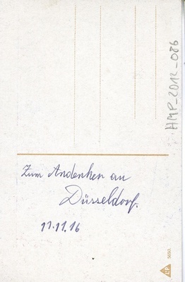 Auf der Vorderseite: Stark nachbearbeitete Fotopostkarte im Hochformat. Ein Soldat in Ulanenuniform sitzt sinnend, vielleicht ermüdet von langer Wache, auf einer felsigen Erhebung und blickt nachdenklich gen Himmel. Er stützt sich mit der rechten Hand auf dem Felsen ab, die linke stemmt er auf den Säbel, den er seitlich aufgestellt hat. Im Hintergrund hebt sich ein Pferd dunkel vom Hintergrund ab, wo am Horizont die aufgehende Sonne die Szene zu erhellen beginnt. Im oberen Teil der Karte wird gleichsam als Wolke am Himmel deutlich, worauf sich die Gedanken des Soldaten richten: Ein Heer von Ulanenreitern stürmt in wildem Galopp, angeführt durch einen säbelschwingenden Offizier, der den Betrachter kriegslustig aus dem Bild heraus anschaut, in die Schlacht. Darüber erhebt sich als Überschrift der Titel der Serie "Morgenrot! Morgenrot! -" Soldat und Gedankenwolke sind durch ein kleines Gedicht in weißen Lettern voneinander getrennt: "Ach, wie bald, ach, wie bald, Schwindet Schönheit und Gestalt! Prahlst Du gleich mit deinen Wangen, Die wie Milch und Purpur prangen, Ach, die Rosen welken bald!". Auf der Rückseite: Serie: "L. & P.; Morgenrot! Morgenrot!, Serie 5650" sowie handschriftlicher Text: "Zum Andenken an Düsseldorf. 11.11.16"