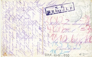 Vorderseite: Nachkolorierte Fotopostkarte im Hochformat. Überschrift: "Frisch-Jäger drauf." Soldat stehend in Jägeruniform mit Gewehr und Tschako, junge Frau mit Schürze in nachdenklicher Pose sitzend. Vor einer Hauswand. Text: "Dort steht der Feind, / ihr Jäger vor! / Schon tönt uns dieser / Ruf in’s Ohr! / Hurra, Hurra, Hurra!". Auf der Rückseite: Adressat: "Wohlgb. Lini Baumgartner / in Hart / bei Mühldorf a. Inn / Oberbayern", Stempel: "(???) Exped. Des Alpenkorps 28.6.16" und "S.B. III. B. bay. J.L.R.", Serie: "L&P; 5880/VI." sowie handschriftlicher Text: "Alpenkorps (...) Jäger (...) I. Bay. Jäger Batt. I. Komp. Geschrieben d. 26.6.16 (...). Liebe Lini! Endlich komme ich einmal dazu Dir einige Zeilen zu schreiben. Bin noch immer gesund, was ich auch von Dir hoffe. Wie es mir geht, kann u. darf ich Dir nicht schreiben. Auch kannst es Dir nicht vorstellen. Ob wir uns noch einmal sehen, das weiß ein anderer, ich glaube (...) (...) Hoffen tut man immer (...) (...) liebe Lini. (...) (...) (...). Es grüßt Dich Dein Dir ewig (...) (...). Gruß an Hans." Quer über die Zeilen: "Aufs Widersehen. Auch Gruß an Eliesabeth und Michael. Bitte Antwort".